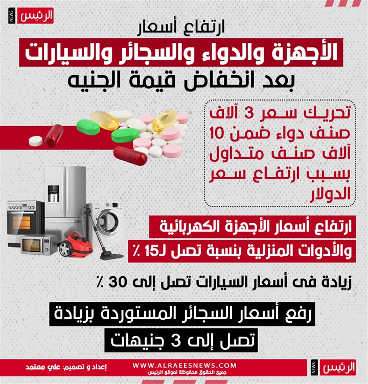 انفوجرافيك| ارتفاع أسعار الأجهزة والدواء والسجائر والسيارات بعد انخفاض قيمة الجنيه