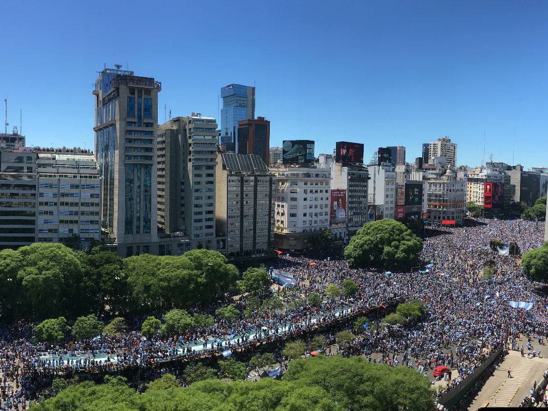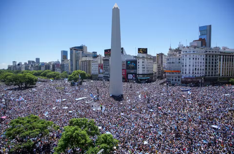 تواجدت أعداد ضخمة من الجماهير الأرجنتينية فى الميادين الرئيسية بالعاصمة بوينس آيرس احتفالا بفوز منتخب الأرجنتين بلقب النسخة رقم 22 من بطولة كأس العالم 2022 التى استضافتها قطر بدءا من 20 نوفمبر الماضى حتى 18 ديسمبر، بمشاركة 32 منتخبا فى 8 ملاعب مختلفة.