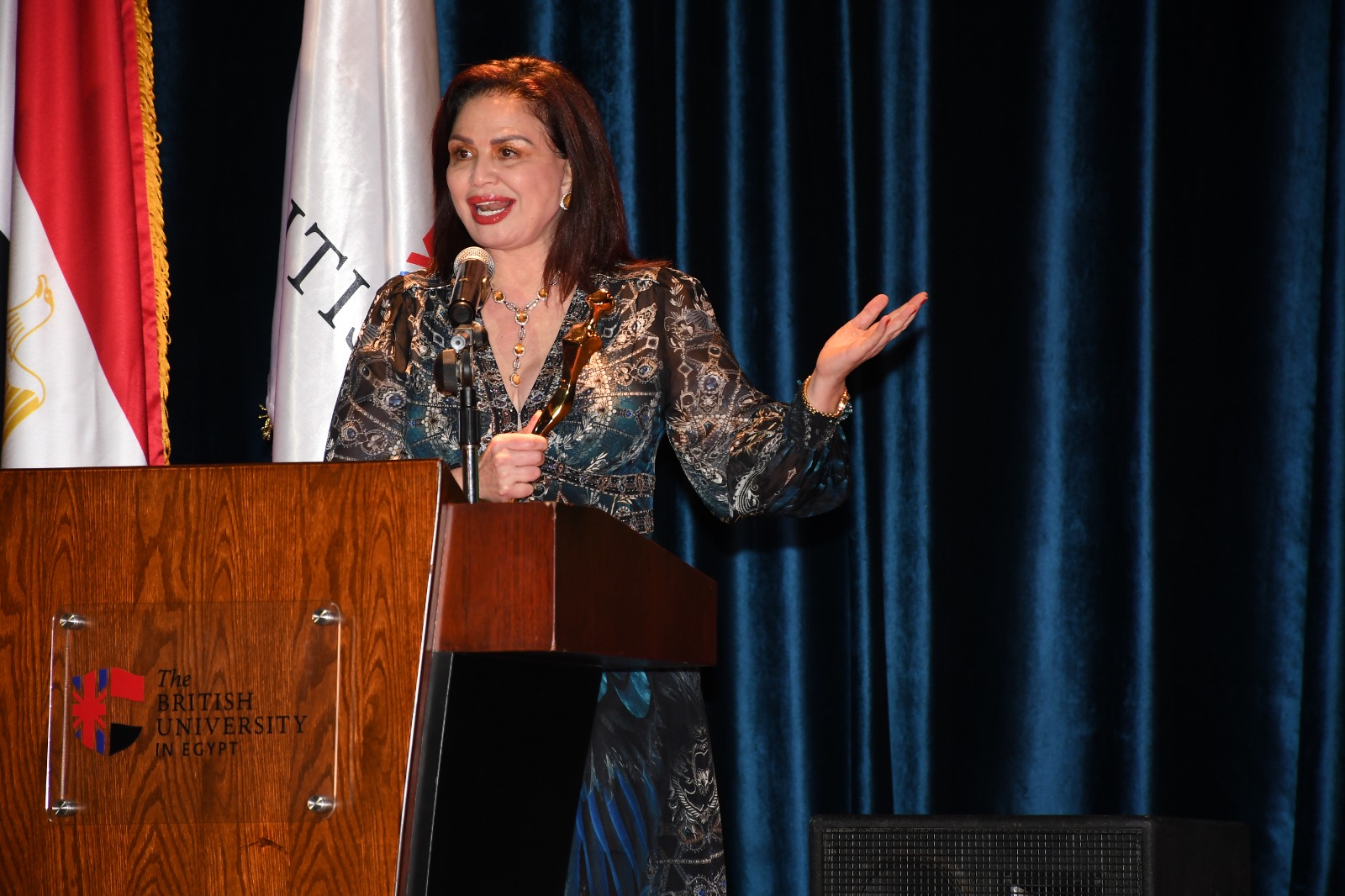 وفي كلمتها أشارت النجمة إلهام شاهين الي أن الجامعة البريطانية في مقدمة الجامعات التي تدعم فن السينما من خلال قسم السينما بكلية الإعلام وشددت علي حرصها الدائم بتلبية الدعوة بالمشاركة في تحكيم مشروعات تخرج طلبته.