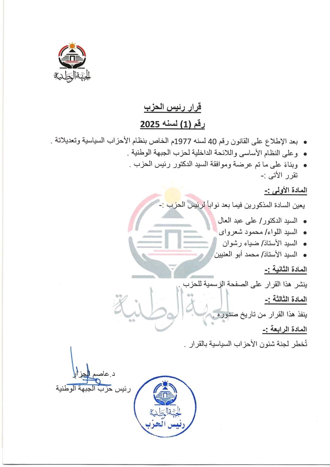 وكان قد أعلن الأعضاء المؤسسون لحزب الجبهة الوطنية اختيار الدكتور عاصم الجزار وزير الإسكان السابق رئيسًا للحزب واختيار السيد القصير وزير الزراعة السابق أمينًا عامًا للحزب.