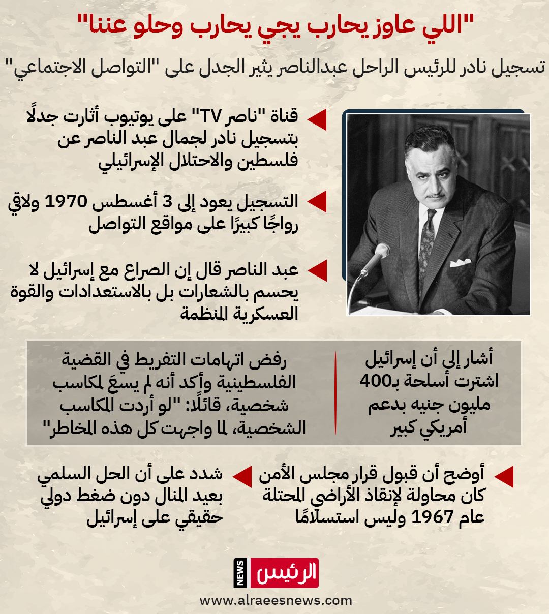 وفي الإنفوجراف التالي نستعرض تفاصيل التسجيل النادر لجمال عبد الناصر عن فلسطين والاحتلال الإسرائيلي: