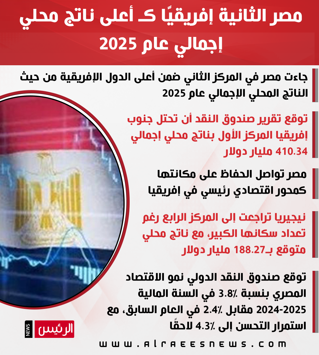 جاءت مصر على قائمة الدول ذات أكبر ناتج محلي إجمالي في إفريقيا عام 2025، لتحتل المركز الثاني من بين دول القارة السمراء.