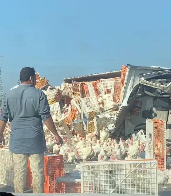 تفاصيل انقلاب سيارة محملة بالدواجن الحية على الطريق الإقليمي (صور)