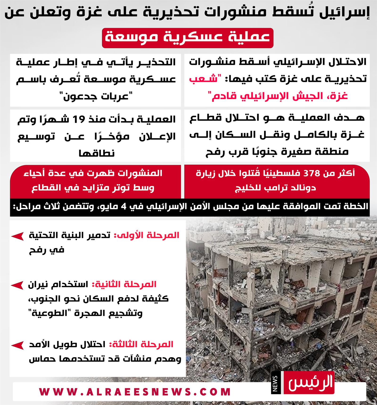 أسقط الاحتلال الإسرائيلي أمس السبت منشورات على قطاع غزة تحمل تحذيرًا يقول: "شعب غزة، الجيش الإسرائيلي قادم"، في إشارة إلى تصعيد عسكري جديد ضمن عملية عسكرية موسعة تُعرف باسم "عربات جدعون".