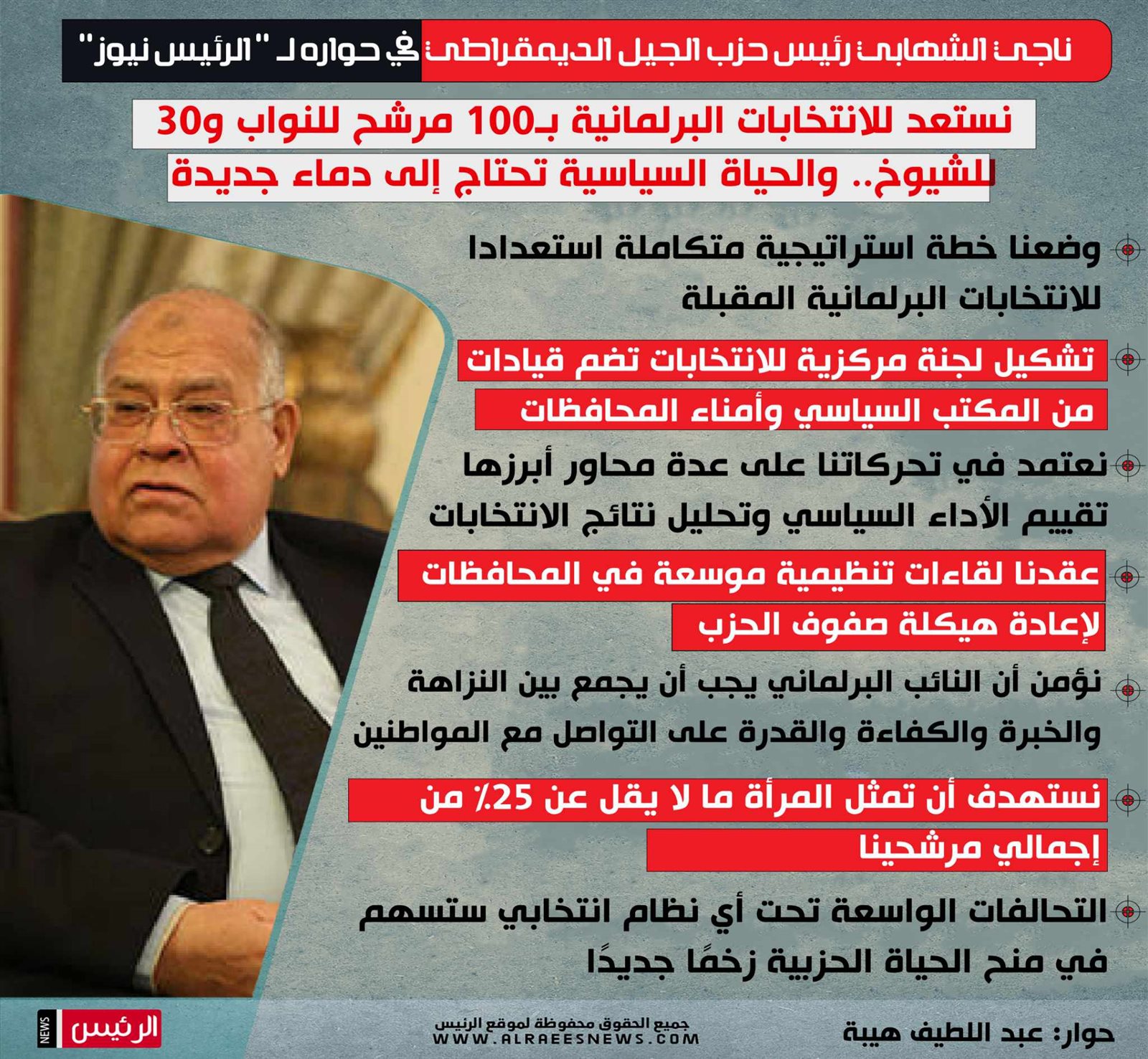 وقال الشهابي في حواره مع موقع "الرئيس نيوز" إن الحزب يستهدف الترشح في 60% من الدوائر الفردية، مع الدفع بما يتراوح بين 80 إلى 100 مرشح لمجلس النواب، و20 إلى 30 مرشحًا لمجلس الشيوخ.