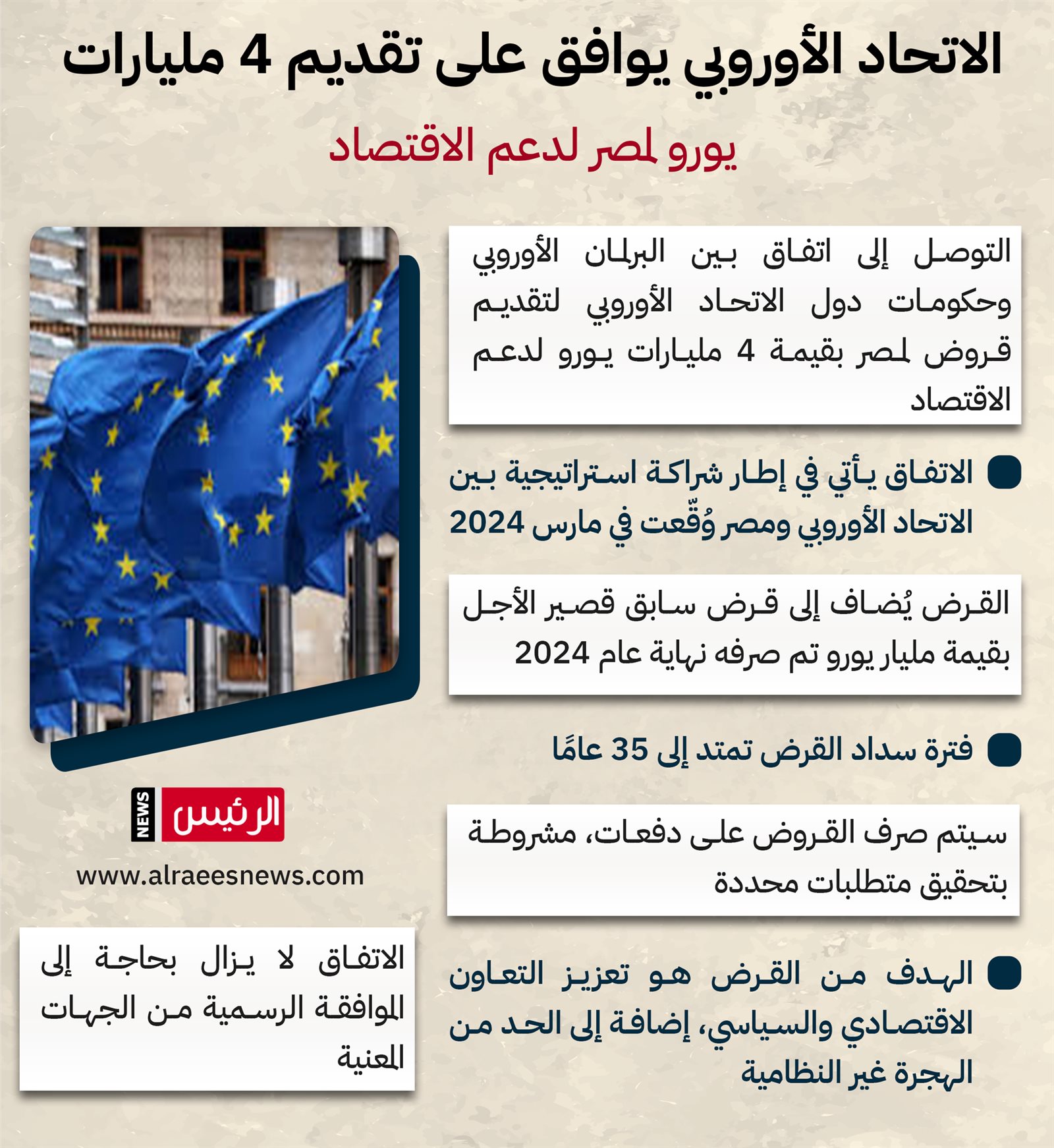 توصل ممثلو البرلمان الأوروبي وحكومات الدول الأعضاء في الاتحاد الأوروبي إلى اتفاق لتقديم قروض بقيمة 4 مليارات يورو (4.5 مليار دولار) لمصر، بهدف دعم اقتصادها وتعزيز التعاون في إطار شراكة استراتيجية.
