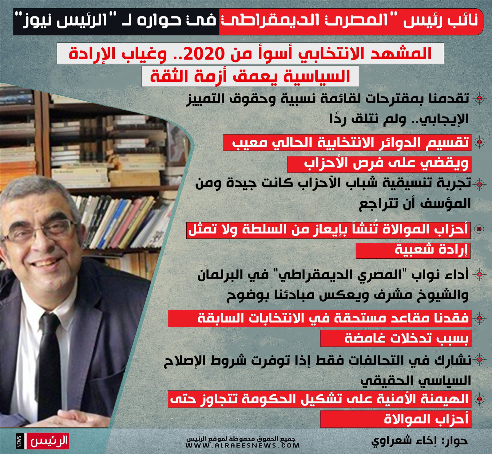 وصف الدكتور إيهاب الخراط، النائب الأول لرئيس الحزب المصري الديمقراطي الاجتماعي، الأجواء السياسية والانتخابية الراهنة في مصر بأنها "أكثر انغلاقًا من ذي قبل"، مؤكدًا أن المنافسة السياسية اليوم أسوأ مما كانت عليه في انتخابات 2020.
