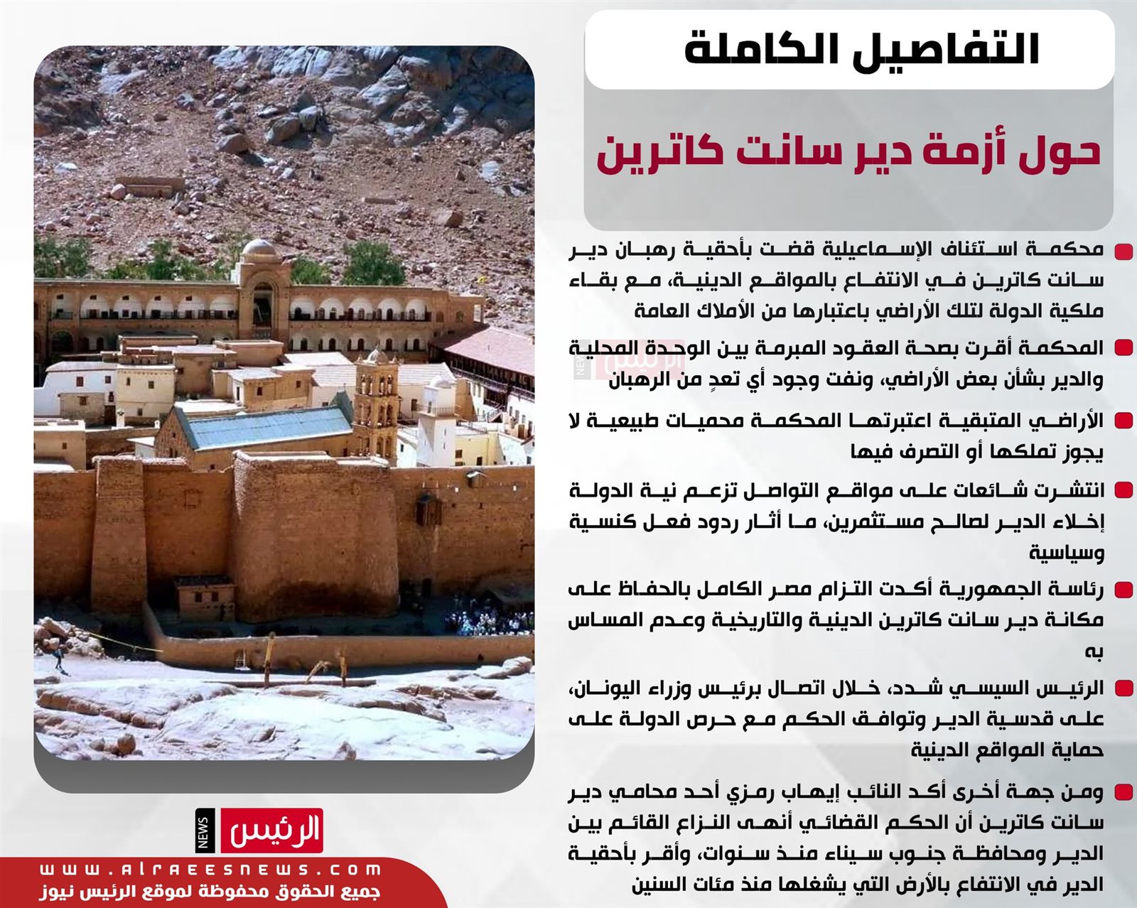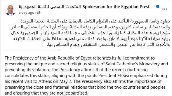 كما أكد الرئيس عبدالفتاح السيسي، لرئيس وزراء اليونان، كيرياكوس ميتسوتاكيس- خلال اتصال هاتفي- التزام مصر الكامل بالحفاظ على المكانة الدينية الفريدة والمقدسة لدير سانت كاترين، وعدم المساس بهذه المكانة، وهو ما يرسخه الحكم القضائي الصادر مؤخرا في هذا الصدد، والذي جاء ليتسق مع حرص مصر على قدسية الأماكن الدينية والكنسية، وتأكيد القيمة التراثية والروحية والمكانة الدينية الفريدة لدير سانت كاترين.