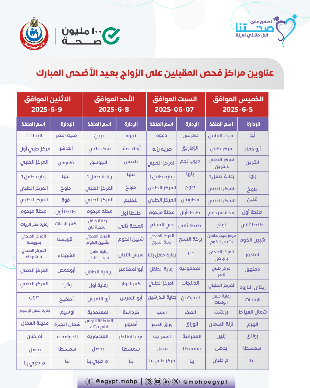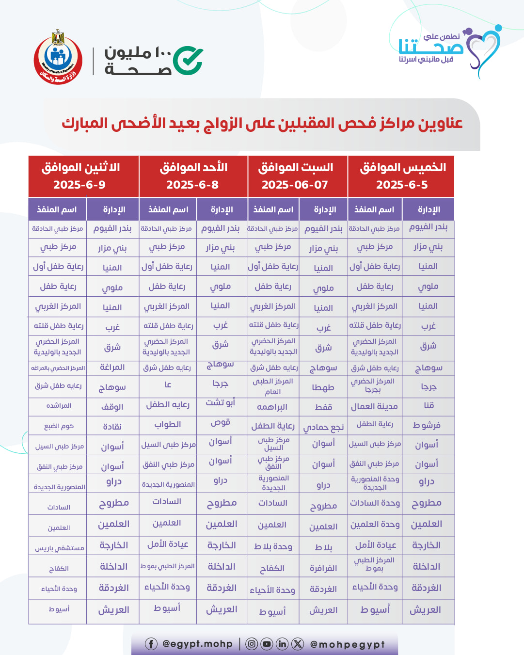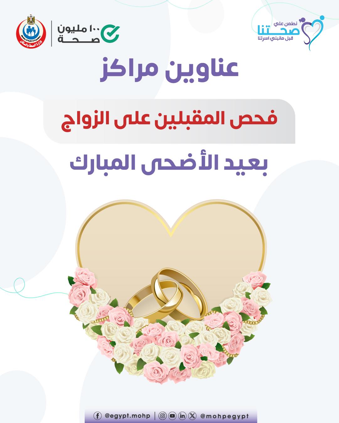 أعلنت وزارة الصحة والسكان، تخصيص العمل بـ 58 مركزًا رئيسيًا بجميع محافظات الجمهورية لإجراء فحوصات المقبلين على الزواج، خلال فترة إجازة عيد الأضحى المبارك.