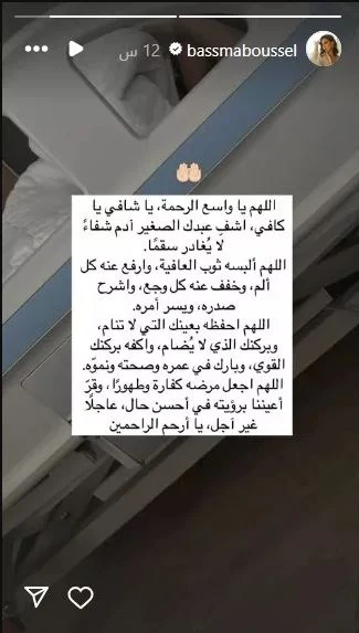 وكتبت بسمة بوسيل عبر خاصية "ستوري" على حسابها الرسمي بموقع "إنستجرام": "اللهم يا واسع الرحمة، يا شافي يا كافي، اشفِ عبدك الصغير آدم شفاءً لا يُغادر سقمًا، اللهم ألبسه ثوب العافية، وارفع عنه كل ألم، وخفف عنه كل وجع، واشرح صدره، ويسّر أمره، اللهم احفظه بعينك التي لا تنام، وبركنك الذي لا يُضام، واكفه بركنك القوي، وبارك في عمره وصحته ونموّه. اللهم اجعل مرضه كفارة وطَهورًا، وقرّ أعيننا برؤيته في أحسن حال، عاجلًا غير آجل، يا أرحم الراحمين".
