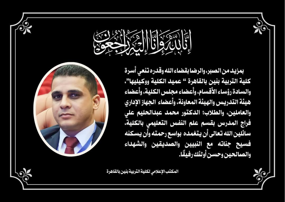 فيما نعت كلية التربية بنين جامعة الأزهر بالقاهرة، عميد الكلية ووكيليها، ورؤساء الأقسام، وأعضاء مجلس الكلية، وأعضاء هيئة التدريس والهيئة المعاونة، وأعضاء الجهاز الإداري والعاملين والطلاب؛ الدكتور محمد عبدالحليم علي فراج المدرس بقسم علم النفس التعليمي بالكلية، سائلين الله تعالى أن يتغمده بواسع رحمته وأن يسكنه فسيح جناته مع النبيين والصديقين والشهداء، والصالحين وحسن أولئك رفيقا.