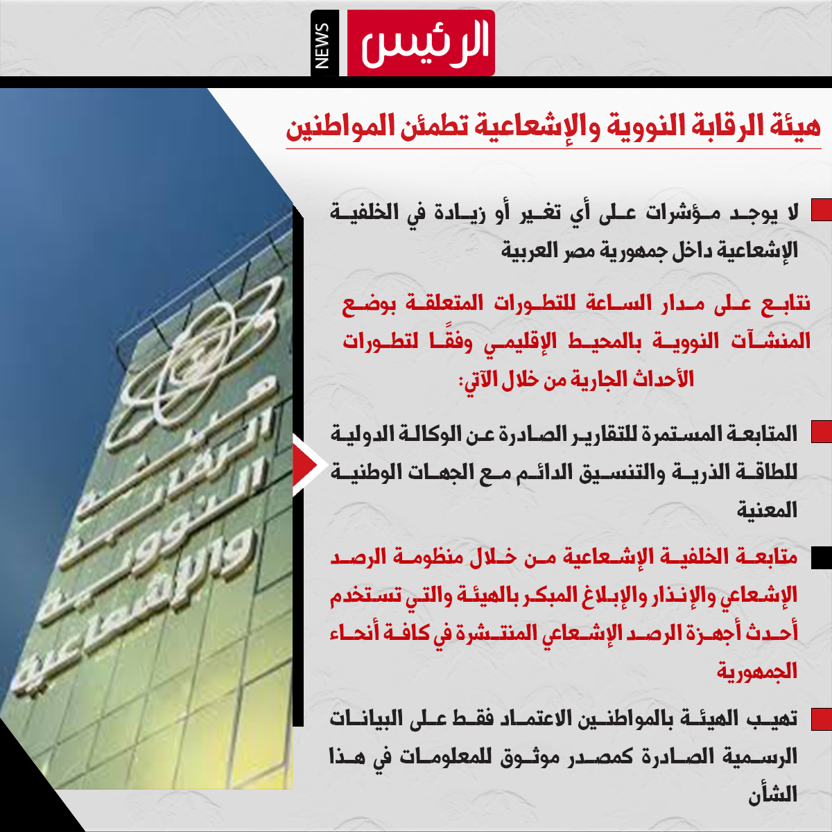 في ضوء التطورات الجارية في المنطقة تود هيئة الرقابة النووية والإشعاعية أن تطمئن المواطنين أنه لا يوجد مؤشرات على أي تغير أو زيادة في الخلفية الإشعاعية داخل جمهورية مصر العربية.