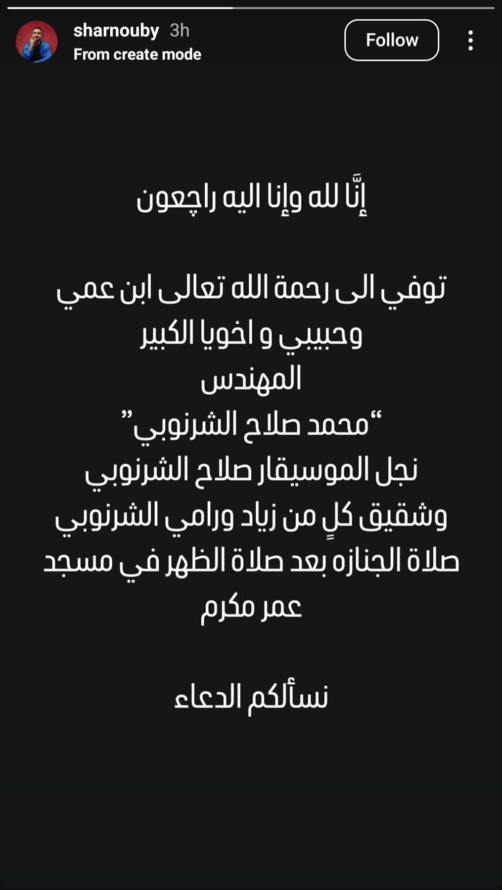 كتب الفنان محمد الشرنوبي عبر صفحته: «إنَّا لله وإنا اليه راجعون توفي إلى رحمة الله تعالى ابن عمي وحبيبي وأخويا الكبير المهندس محمد صلاح الشرنوبي نجل الموسيقار صلاح الشرنوبي، وشقيق كل من زياد ورامي الشرنوبي».