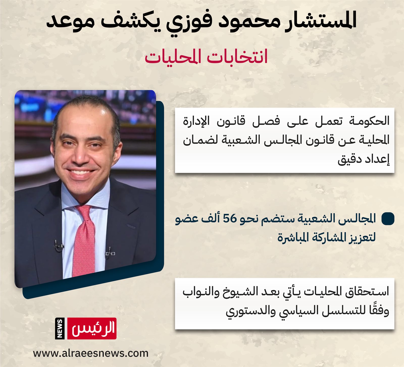 كشف المستشار محمود فوزي وزير الشؤون النيابية، موعد إجراء انتخابات المحليات، مؤكدًا أنها يأتي بعد انتخابات مجلسي الشيوخ والنواب وفقًا للتسلسل السياسي والدستوري.