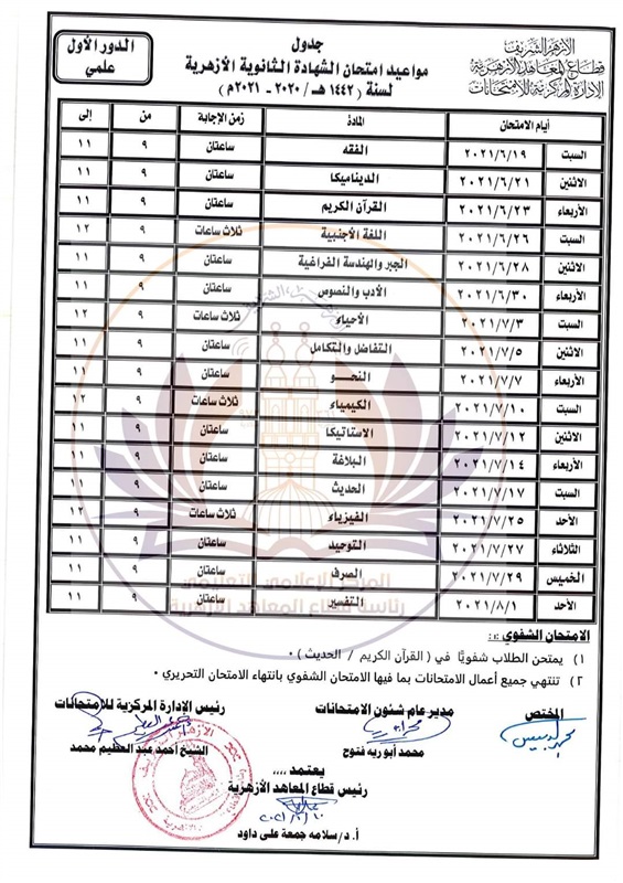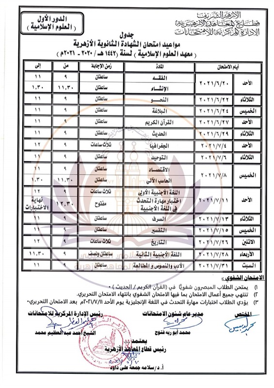 أعلن قطاع المعاهد الأزهرية جدول امتحانات الشهادة الثانوية للعام 2020-2021، حيث كان قد حدد قطاع المعاهد الأزهرية موعد انطلاق امتحانات الشهادة الثانوية الدور الأول، لتنطلق يوم 19 يوينو وتنتهى يوم 1 أغسطس، على أن تبدأ امتحانات الدور الثانى للثانوية يوم 4 سبتمبر وتنتهى يوم 13 سبتمبر.