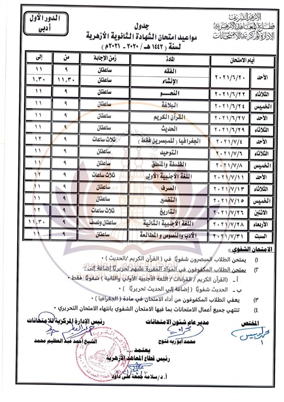 وأظهرت الجداول امتحان الطلاب مادة واحدة فى اليوم، علي أن يمتحن طلاب القسم الأدبي في يوم منفرد عن طلاب القسم العلمى.