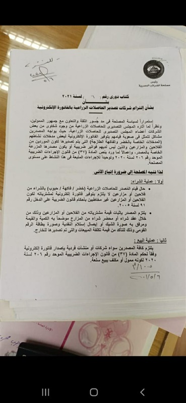 وبحسب القرار الذى حصل الرئيس نيوز على نسخة منه فإنه حال شراء المصدر " حبوب – خضر – فاكهة" من فلاحين لا يشترط عليه توفير فاتورة الكترونية خاصة ان الفلاحين غير مخاطبين بالضريبة على الدخل، واستبدال ذلك بعقد شراء موثق به الكميات والقيمة وشيك استلام النقدية.