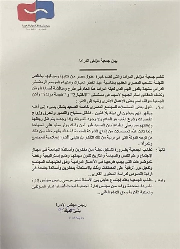 وكشفت الجمعية خلال بيانها عن رؤيتها للموسم الدرامي الرمضاني، مبدية سعادتها بمسلسلات "الاختيار ٢" و"هجمة مرتدة"، وتوقفت الجمعية خلال بيانها امام بعض الأعمال الأخرى، مبدية بعض الملاحظات.