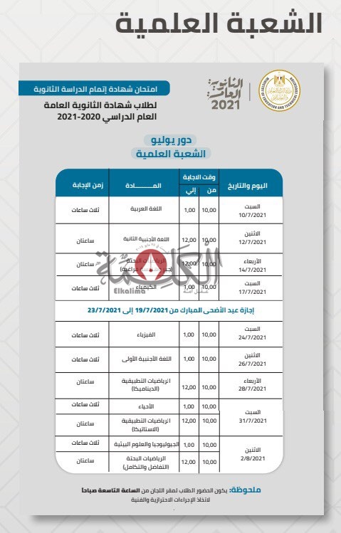 أعلن الدكتور طارق شوقي وزير التربية والتعليم بدء الامتحانات الثانوية العامة 10 يوليو المقبل، بدلا من 4 يوليو؛ لإعطاء فرصة أكبر للطلاب للتحضير وتنتهي الامتحانات 2 أغسطس، مع إعطاء إجازة لمدة أسبوع، وهي إجازة عيد الأضحى، ويتم استئناف الامتحانات عقب العيد.