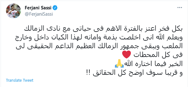 وكتب فرجاني ساسي عبر حسابه الرسمي على موقع التواصل الاجتماعي «تويتر»: «بكل فخر اعتز بالفترة الاهم فى حياتى مع نادى الزمالك ويعلم الله انى اخلصت بذمة وامانه لهذا الكيان داخل وخارج الملعب ويبقى جمهور الزمالك العظيم الداعم الحقيقى لى فى كل المحطات ..الخير فيما اختاره الله و قريبا سوف اوضح كل الحقائق !!».