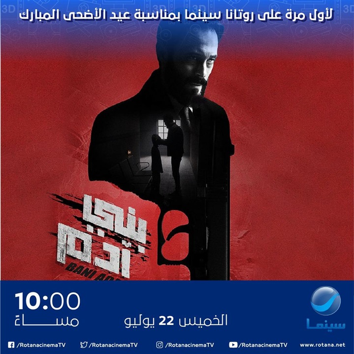 وفى ثالث ايام عيد الاضحى الخميس ٢٣ يوليو تعرض روتانا سينما فى التوقيت ذاته العاشرة مساء فيلم " بنى آدم " بطولة النجم المتميز يوسف الشريف - دينا الشربينى - أحمد رزق - هنا الزاهد - محمود الجندى.