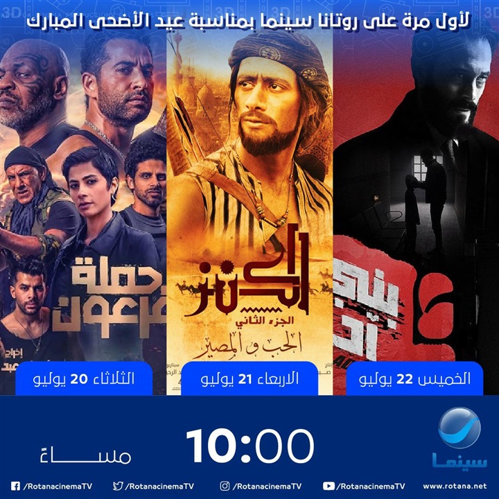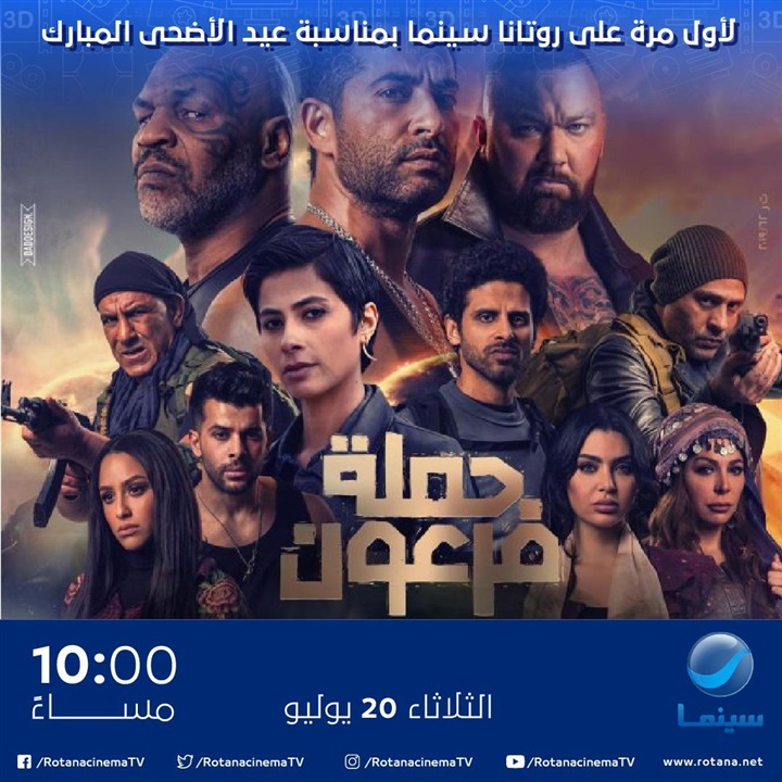 تعايد قناة روتانا سينما مشاهديها بثلاثة أفلام حديثه من أقوى انتاجات السينما المصريه في أيام عيد الأضحى المبارك، حيث تقدم لهم أول أيام العيد مساء الثلاثاء ٢١ يوليو الساعة العاشرة مساء، فيلم "حملة فرعون " في عرضه الأول على الفضائيات العربية .