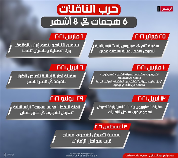انفوجرافيك| حرب الناقلات تشتعل بين إيران وإسرائيل.. 6 هجمات في 8 أشهر