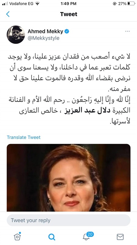كتب أحمد مكي تغريدة له علي تويتر منذ قليل ينعي من خلالها وفاة الفنانة دلال عبد العزيز.