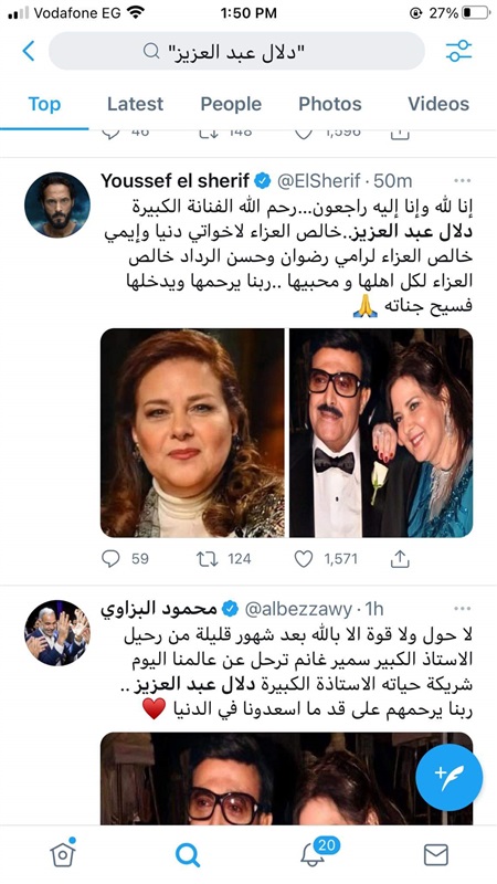 وقال الفنان يوسف الشريف : إنا لله وإنا إليه راجعون…رحم الله الفنانة الكبيرة دلال عبد العزيز..خالص العزاء لاخواتي دنيا وإيمي خالص العزاء لرامي رضوان وحسن الرداد خالص العزاء لكل اهلها و محبيها ..ربنا يرحمها ويدخلها فسيح جناته