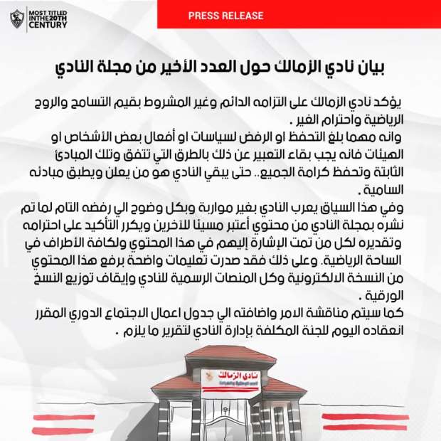 أصدرت اللجنة المسؤولة عن إدارة نادي الزمالك برئاسة حسين لبيب، بيانًا رسميًا بشأن ما نشرته مجلة نادي الزمالك وأثارت حوله الجدل، وذلك حفاظا على عدم إثارة الفتنة بين الجماهير والعمل بمبدأ المنافسة الشريفة والروح الرياضية.