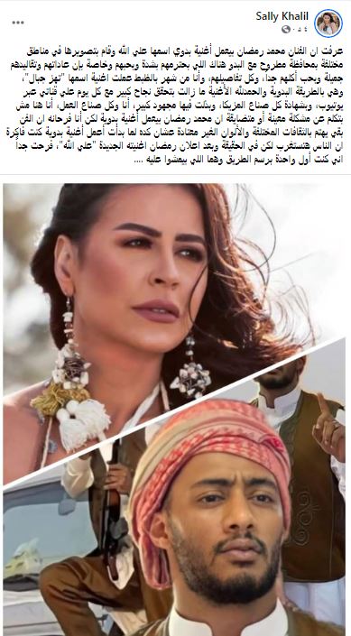 وكتبت سالي خليل عبر صفحتها الشخصية علي موقع التواصل الاجتماعي “فيسبوك” : "عرفت ان الفنان محمد رمضان بيعمل أغنية بدوي اسمها علي الله وقام بتصويرها في مناطق مختلفة بمحافظة مطروح مع البدو هناك اللي بحترمهم بشدة وبحبهم وخاصة بإن عاداتهم وتقاليدهم جميلة وبحب أكلهم جداً، وكل تفاصيلهم، وأنا من شهر بالظبط عملت اغنية اسمها "تهز جبال"، وهي بالطريقة البدوية والحمدلله الأغنية ما زالت بتحقق نجاح كبير مع كل يوم علي قناتي عبر يوتيوب، وبشهادة كل صناع المزيكا، وبذلت فيها مجهود كبير، أنا وكل صناع العمل".