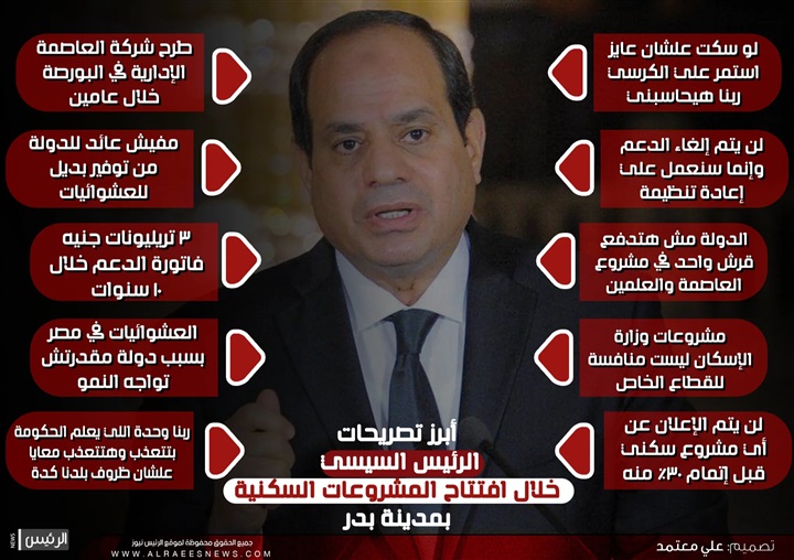 انفوجرافيك| أبرز تصريحات الرئيس السيسي خلال افتتاح المشروعات السكنية بمدينة بدر
