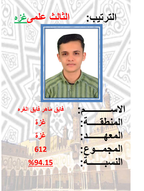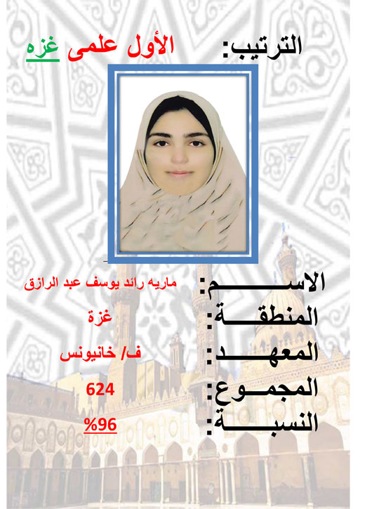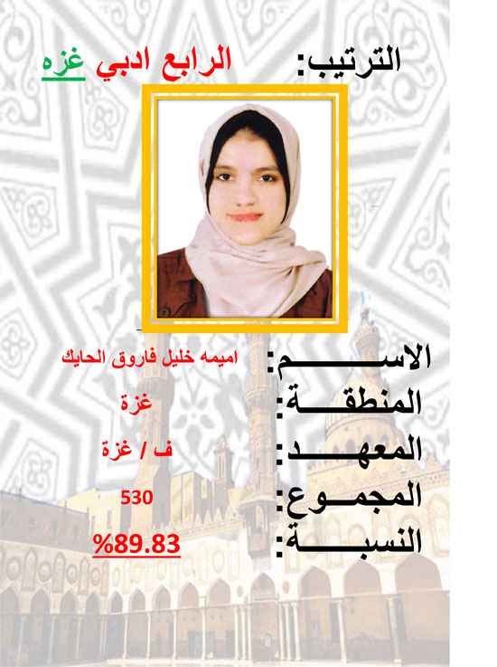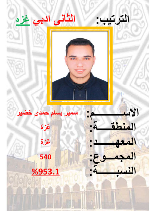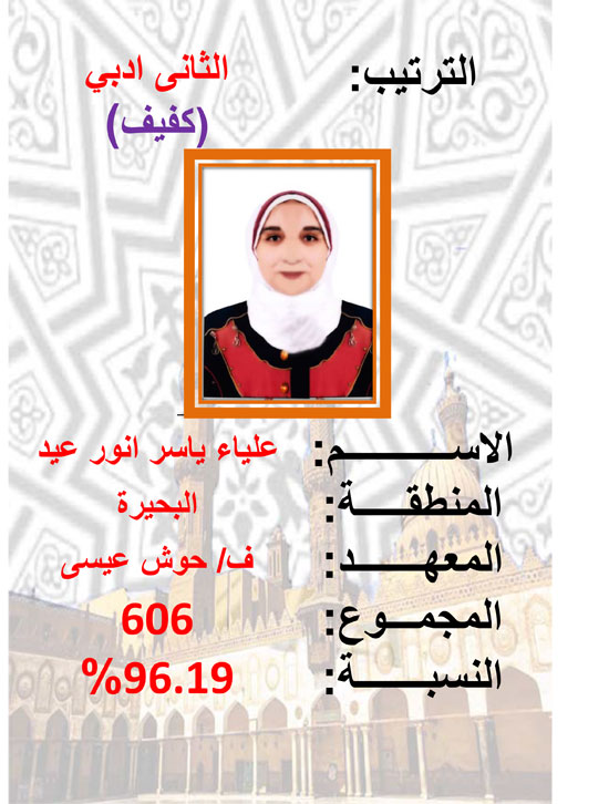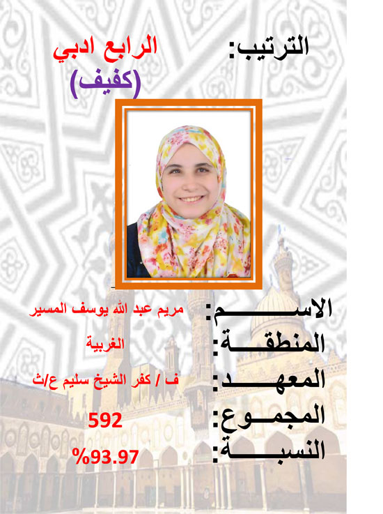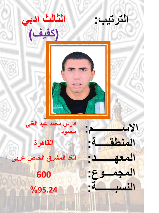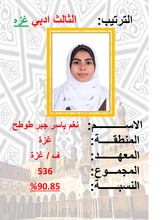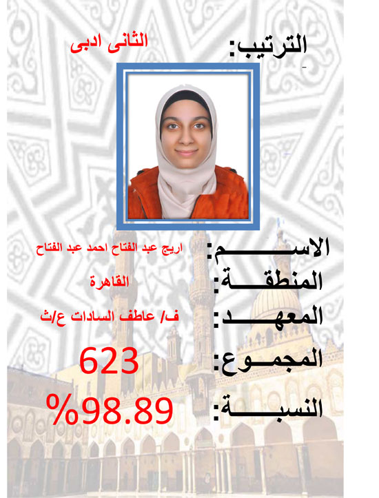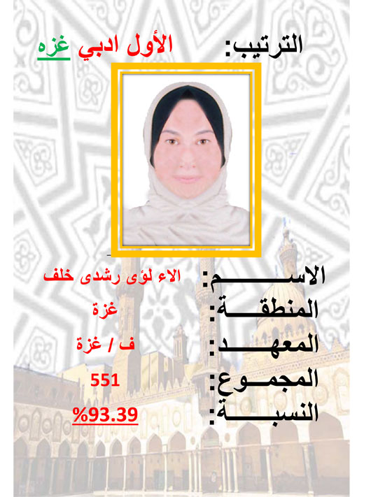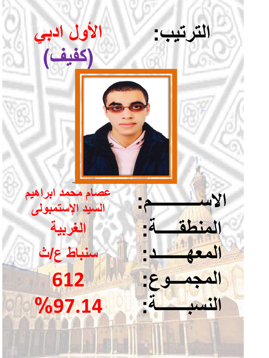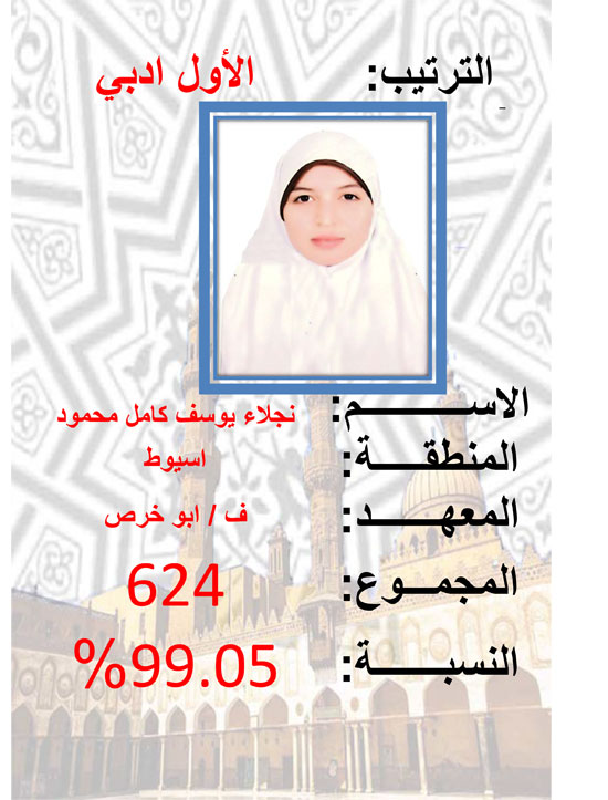 كما حصلت الطالبة نجلاء يوسف كامل محمود "معهد فتيات ألو خوص، محافظة أسيوط" على المركز الأول على القسم الأدبى بنسبة 99.5% بينما حصل الطالب عصام محمد ابراهيم السيد "معهد سنيان، محافظة الغربية"، على المركز الأول على مستوى الطلاب الإكِفَّاء بنسبة 97.14%.