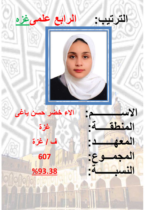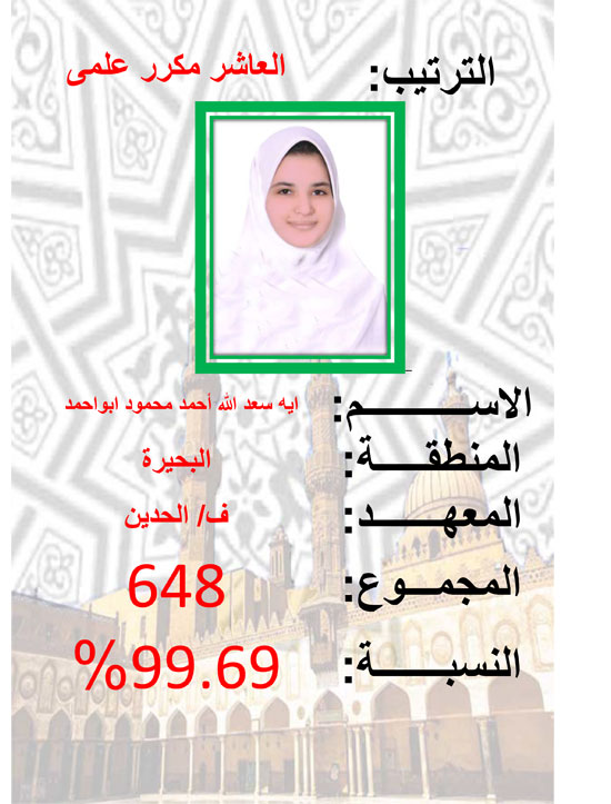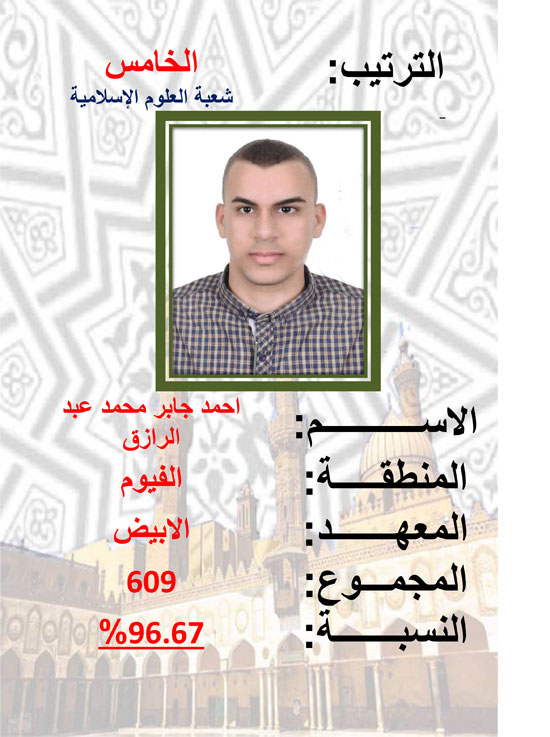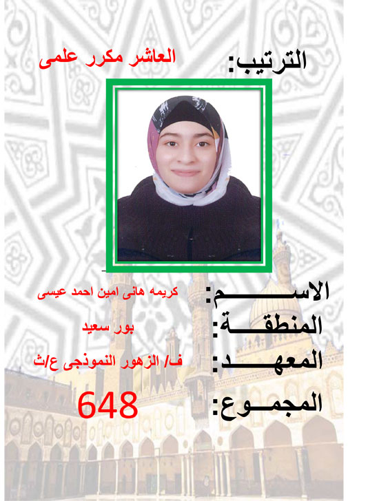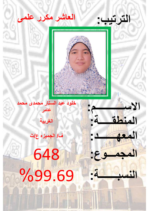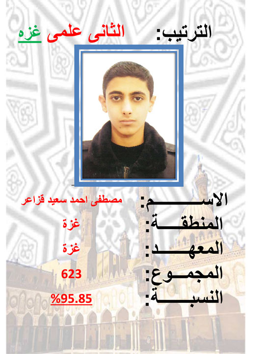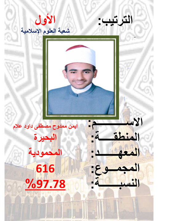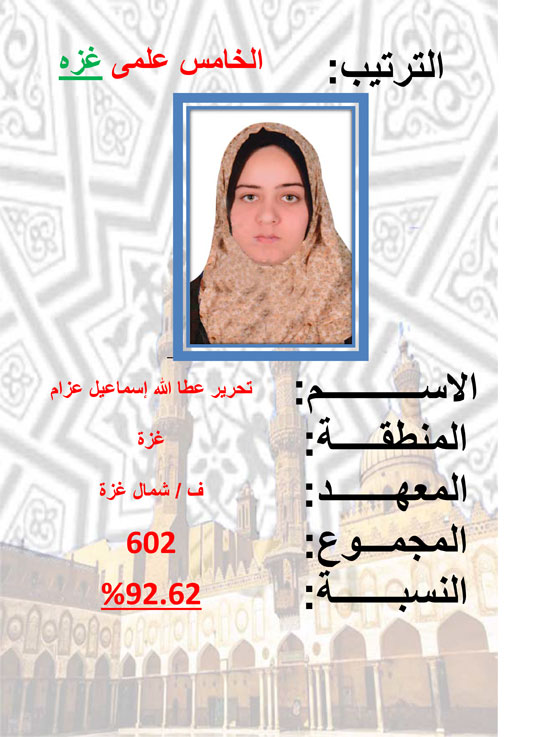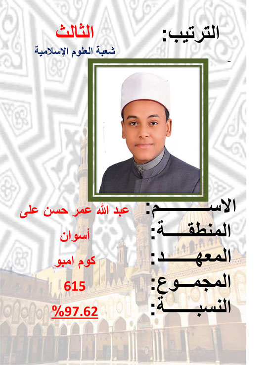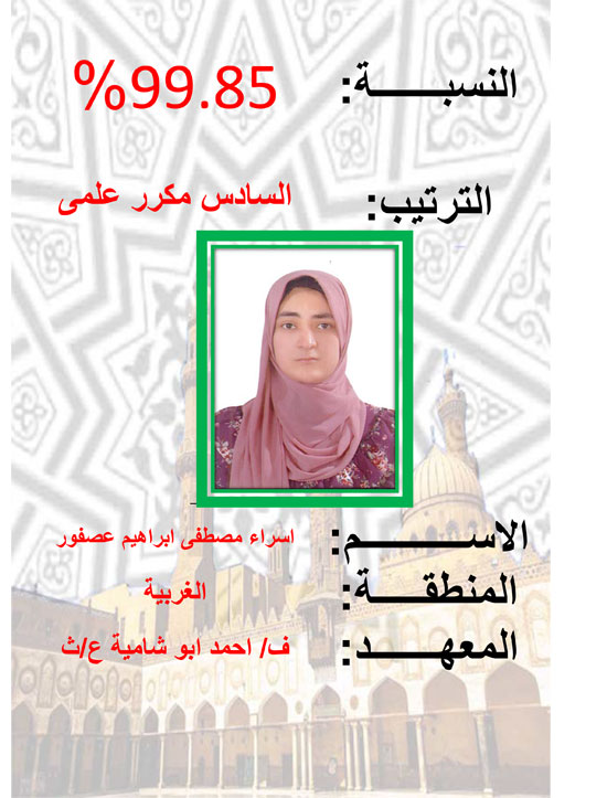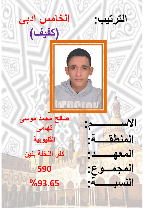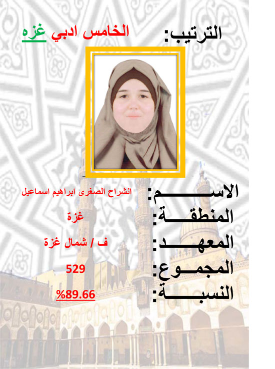 كما حصلت الطالبة نجلاء يوسف كامل محمود "معهد فتيات ألو خوص، محافظة أسيوط" على المركز الأول على القسم الأدبى بنسبة 99.5% بينما حصل الطالب عصام محمد ابراهيم السيد "معهد سنيان، محافظة الغربية"، على المركز الأول على مستوى الطلاب الإكِفَّاء بنسبة 97.14%.