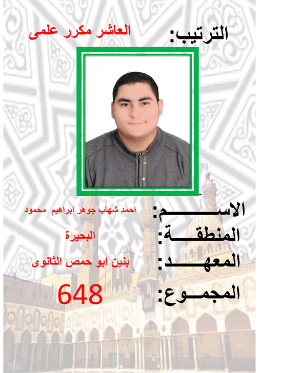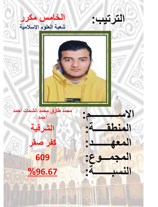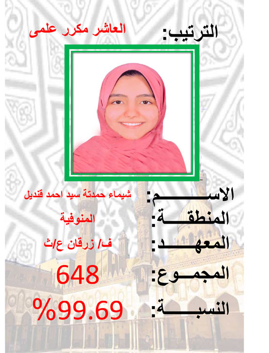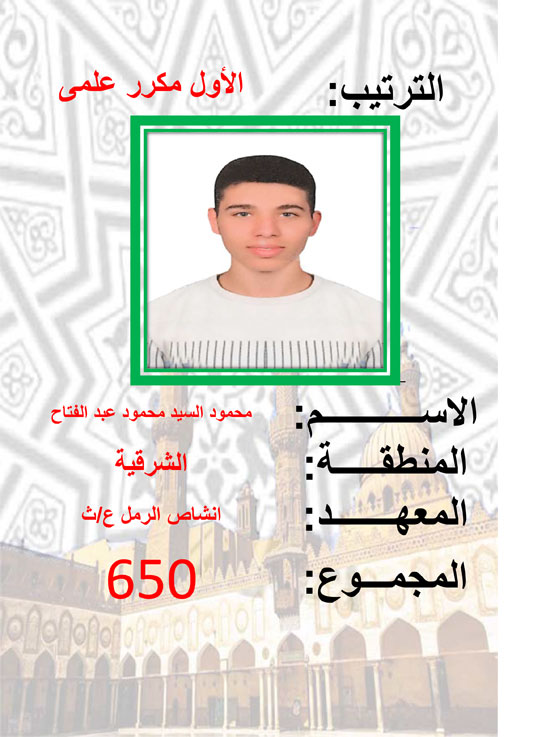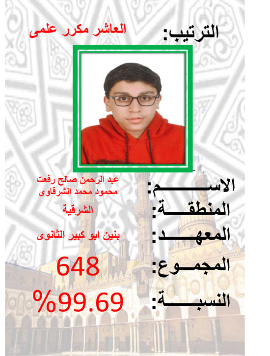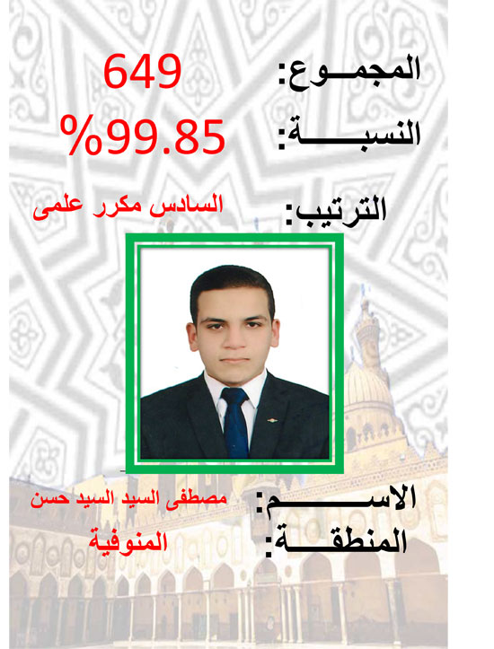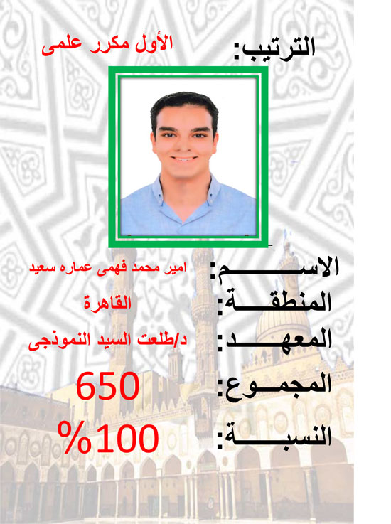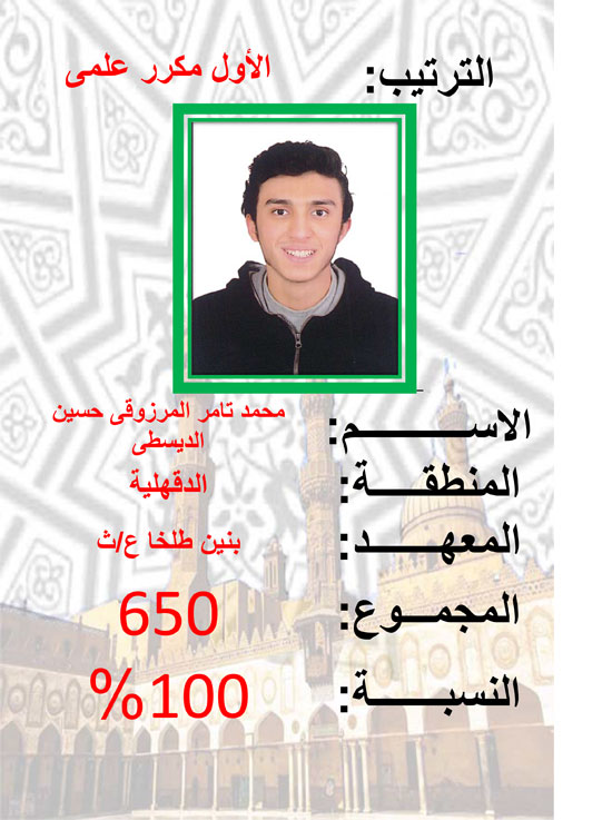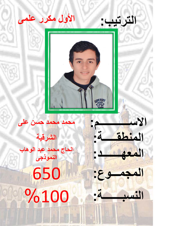 وحصل الطلاب: أحمد محمد جمال سليمان "معهد ميت غمر، محافظة الدقهلية"، وأمير محمد فهمى عمارة "معهد دكتور طلعت السيد النموذجي، محافظة القاهرة)، ومحمد تامر المرزوقى حسين "معهد طلخا، محافظة الدقهلية"، ومحمد محمد حسن على "معهد الحج محمد عبد الوهاب النموذجي، محافظة الشرقية"، ومحمود السيد محمود عبد الفتاح "معهد انشاص الرمل، محافظة الشرقية" على المركز الأول على القسم العلمى بنسبة 100%.