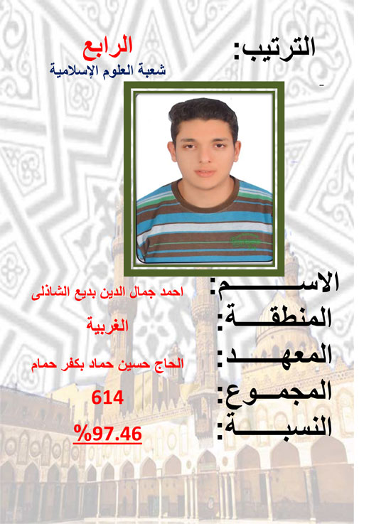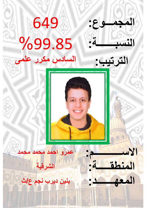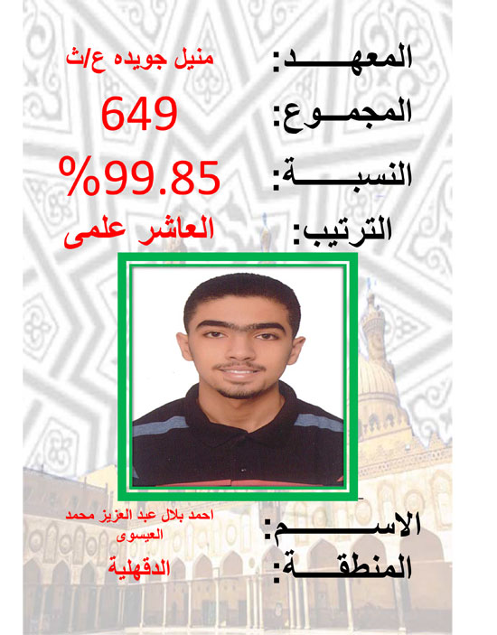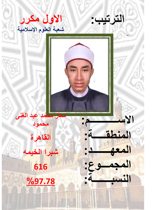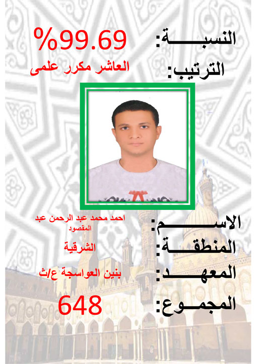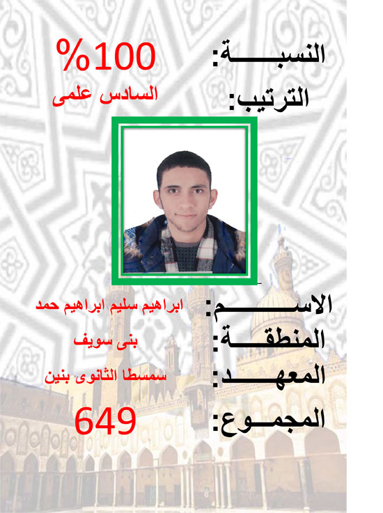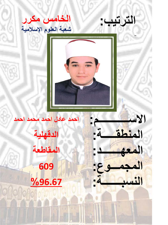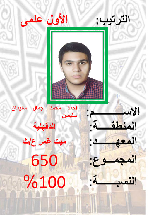 وحصل الطلاب: أحمد محمد جمال سليمان "معهد ميت غمر، محافظة الدقهلية"، وأمير محمد فهمى عمارة "معهد دكتور طلعت السيد النموذجي، محافظة القاهرة)، ومحمد تامر المرزوقى حسين "معهد طلخا، محافظة الدقهلية"، ومحمد محمد حسن على "معهد الحج محمد عبد الوهاب النموذجي، محافظة الشرقية"، ومحمود السيد محمود عبد الفتاح "معهد انشاص الرمل، محافظة الشرقية" على المركز الأول على القسم العلمى بنسبة 100%.