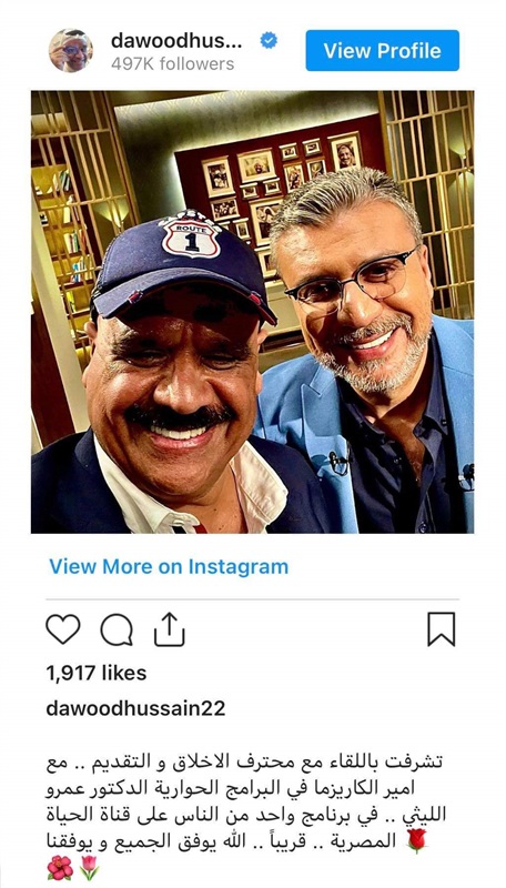 نشر الفنان الكويتي الشهير داوود حسين صورة تجمعه بالإعلامي د. عمرو الليثي من كواليس حلقته معه في برنامج “واحد من الناس”، والتي من المقرر عرضها قريبا علي شاشة الحياة .