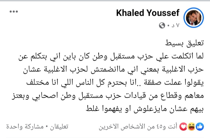 فسر خالد حديثه الذي اثار جدلا قد يصل إلى غضب البعض، وعبر صفحته الرسمية بموقع التواصل الاجتماعي فيس بوك كتب تدوين قال فيها : " تعليق بسيط .. لما اتكلمت علي حزب مستقبل وطن كان باين اني بتكلم عن حزب الاغلبية بمعني اني ماانضمتش لحزب الاغلبية عشان يقلوا عملت صفقة ..انا بحترم كل الناس اللي انا مختلف معاهم وقطاع من قيادات حزب مستقبل وطن اصحابي وبعتز بيهم عشان مايزعلوش او يفهموا غلط".