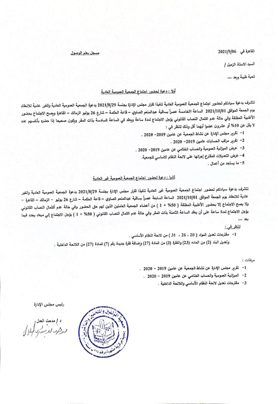 قررت الجمعية عقد اجتماع الأعضاء العادي في تمام الساعة الخامسة عصرا، وفيه سيتم النظر على عدد من الملفات منها تقرير مجلس إدارة نشاط الجمعية عن عامين 2019 و2020، وتقرير مراقب الحسابات عامين 2019 و2020، وعرض الميزانية العمومية والحساب الختامي عن عامين 2019 و2020 وعرض التعديلات المقترح أجراؤها على لائحة النظام الأساسي للجمعية.