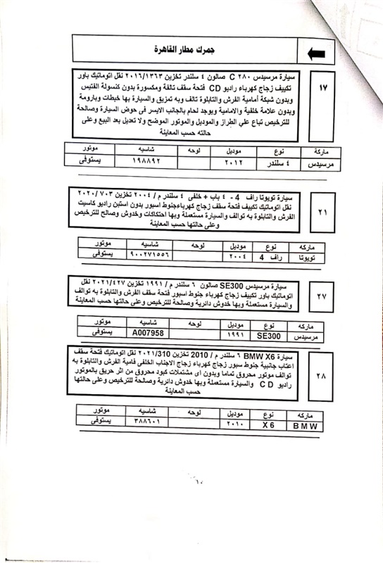 ويمكن معاينة السيارات بساحة جمارك السيارات بمطار القاهرة الدولي بالقرب من موقف الأتوبيسات بمطار القاهرة وساحة أرض المعارض بشارع صلاح سالم من الساعة 9 صباحا وحتى 2 ظهرا خلال أيام العمل الرسمية وحتى يوم عقد المزاد .