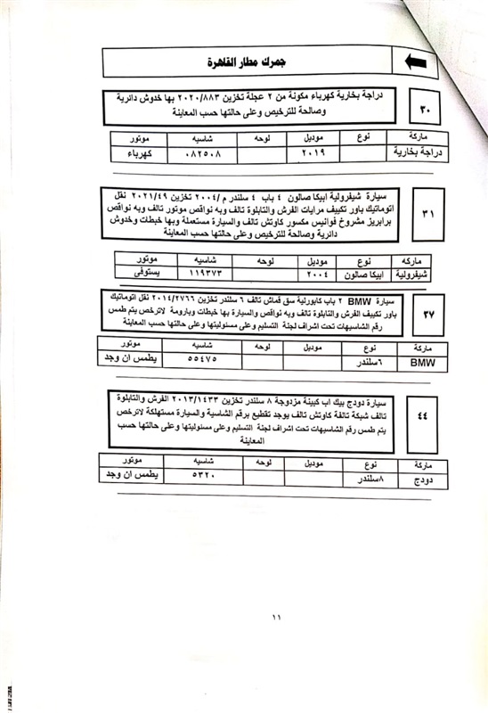 تعقد مصلحة الجمارك ظهر الأربعاء المقبل الموافق 2021/9/15 بقاعة النادي المصري القاهري بعين الصيرة بجوار حديقة الفسطاط جلسة المزاد العلني المقررة لبيع 26 لسيارات وموتوسيكل ولوط مواتير واردة من الخارج ومخزنة بساحة جمارك السيارات بمطار القاهرة الدولي .