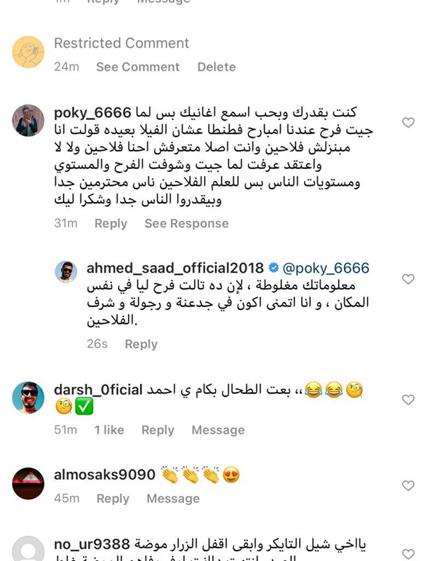 ورد الفنان أحمد سعد علي هذا الهجوم العنيف قائلاً "معلوماتك مغلوطة لأن ده تالت فرح ليا في نفس المكان وأنا أتمني أكون في جدعنة ورجولة وشرف الفلاحين".