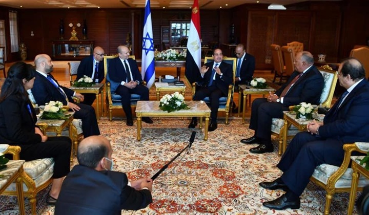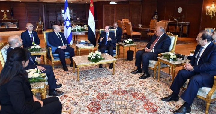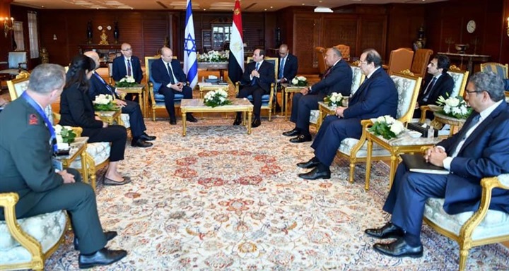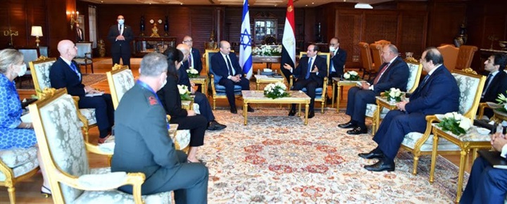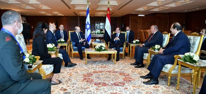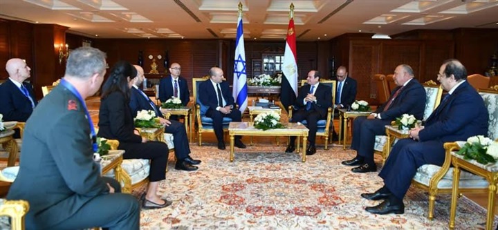 نشر السفير بسام راضي، المتحدث باسك رئاسة الجمهورية، صور استقبال الرئيس عبدالفتاح السيسي اليوم بمدينة شرم الشيخ، رئيس الوزراء الإسرائيلي نفتالي بينيت، بحضور سامح شكري وزير الخارجية وعباس كامل رئيس المخابرات العامة، والدكتور آيال هولاتا رئيس مجاس الأمن القومي الإسرائيلي والفريق أول آلي جيل السكرتير العسكري لرئيس الوزراء وشيمريت مائير كبيرة المستشاريين والسفيرة الإسرائلية في القاهرة.