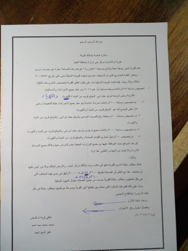 ناشد أهالي قرية أم الساس التابعة لمركز بني مزار بالمنيا الرئيس عبدالفتاح السيسي إدراج قريتهم ضمن قرى المرحلة الأولى بمبادرة تطوير الريف المصري "حياة كريمة".