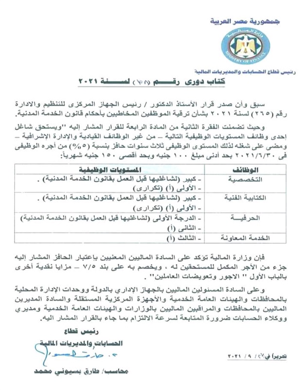 وتضمن الكتاب الدوري الذى حصل الرئيس نيوز على نسخة منه على أن يستحق شاغل إحدى الوظائف المستويات الوظيفية التالية من غير الوظائف القيادية والادارة الاشرافية ومضى على شغله 3 سنوات حافز بنسبة 5% من أجره الوظيفي بحد ادنى 100 جنيه وبحد اقصى 150 جنيه شهريا.