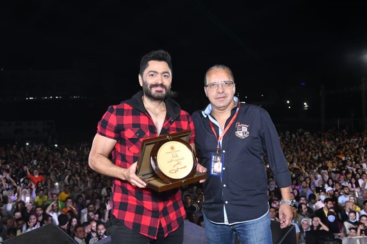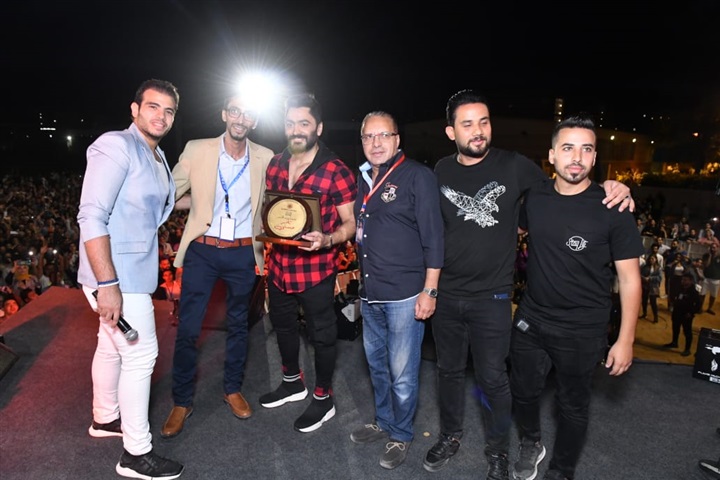 وقبل انتهاء فقرته تم تكريم تامر حسني وإهدائه درع الجامعة كأفضل مطرب عريي.