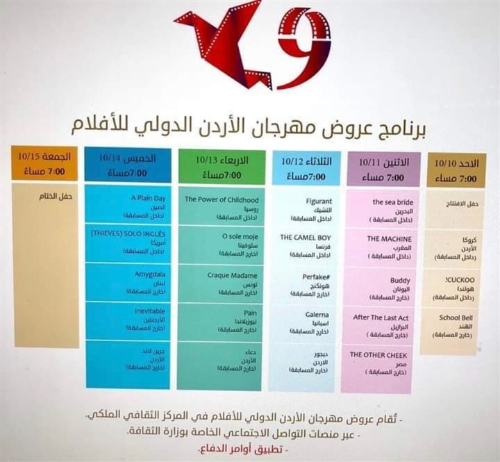 استعدادات مكثفة تقوم بها وزارة الثقافة الأردنية تمهيدا لإنطلاق الدورة التاسعة من مهرجان الأردن الدولي للفيلم، ويقام المهرجان من 10 إلى 15 أكتوبر على مسارح المركز الثقافي الملكي، ويشارك في المسابقة الرسمية للمهرجان 8 أفلام هي على النحو التالي :