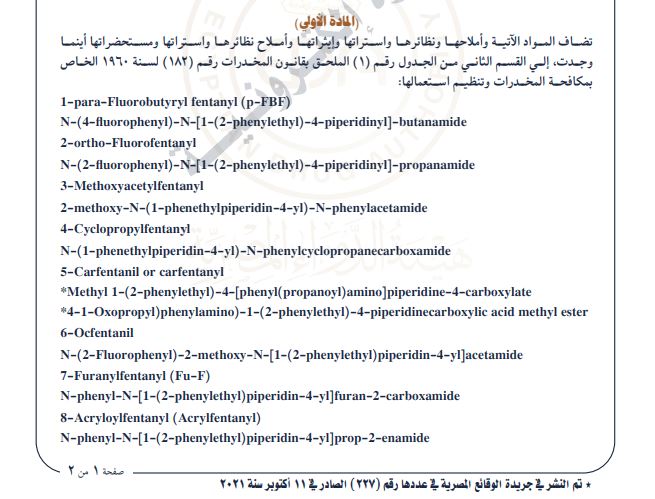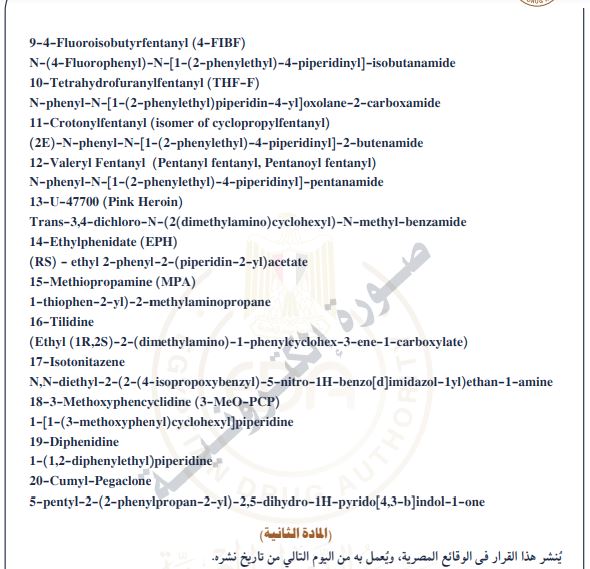 أعلنت هيئة الدواء المصرية إضافة ٢٠ مادة جديدة إلى القسم الثاني من الجدول رقم (۱) الملحق بقانون المخدرات رقم (١٨٢) لسنة ١٩٦٠ الخاص بمكافحة المخدرات وتنظيم استعمالها.