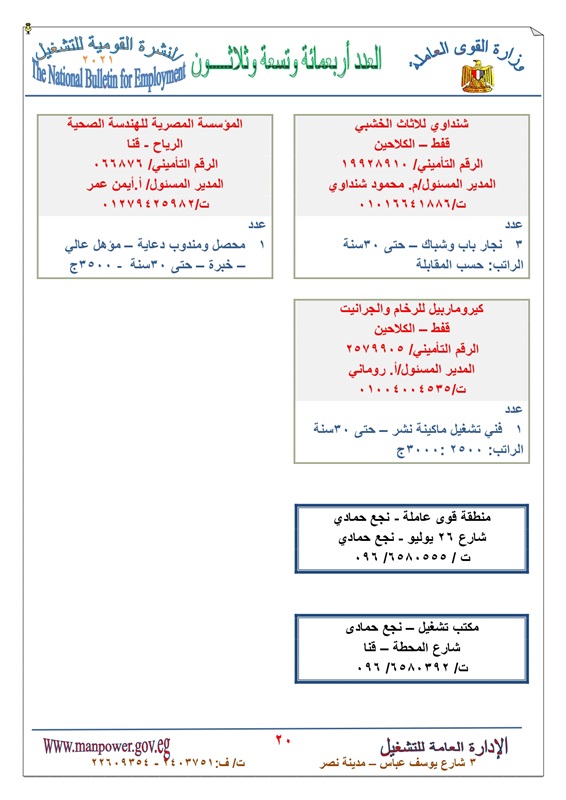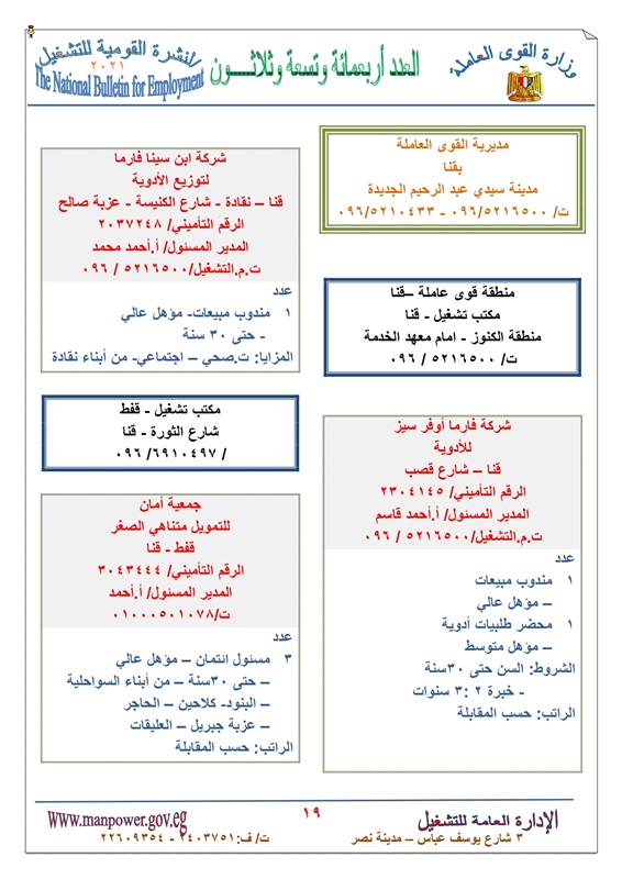 أما قنا فقد وفرت فرص عمل متنوعة فى العديد من المجالات ومنها : 2 مندوب مبيعات ، و3 مسئول ائتمان ، و محصل ، ومندوب دعاية ، ومحضر طلبيات أدوية ، و فنى تشغيل ماكينة نشر ، و 3 نجار باب وشباك .