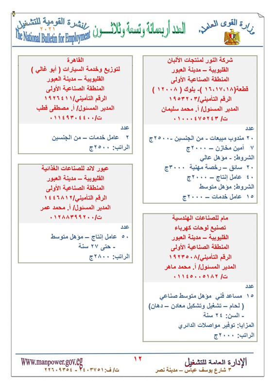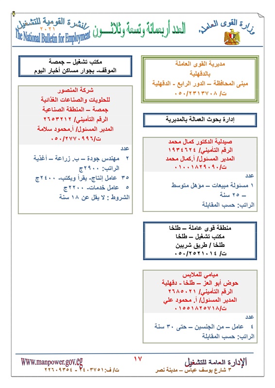 وفى الدقهلية يوجد 47 فرصة عمل متاحة ، منها : 2 مهندس جودة، ومسئولة مبيعات ، و35 عمال انتاج ، و 9 عمال خدمات .